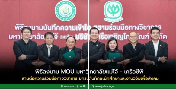 เมื่อวันที่ 11 ธันวาคม 2568 เวลา 09.30-11.30 น. สำนักวิจัยฯ มหาวิทยาลัยแม่โจ้ นำโดย รองศาสตราจารย์ ดร.พัชรินทร์ สุภาพันธ์ รองผู้อำนวยการสำนักวิจัยฯ ฝ่ายบริการวิชาการ และ ผู้ช่วยศาสตราจารย์ ดร.สุบรรณ ฝอยกลาง รองผู้อำนวยการสำนักวิจัยฯ ฝ่ายวิจัย ร่วมพิธีลงนามบันทึกความเข้าใจความร่วมมือทางวิชาการระหว่าง มหาวิทยาลัยแม่โจ้ กับ บริษัทเครือเจริญโภคภัณฑ์ จำกัด ณ ห้องประชุมสภามหาวิทยาลัย ชั้น 5 อาคารสำนักงานมหาวิทยาลัย มหาวิทยาลัยแม่โจ้